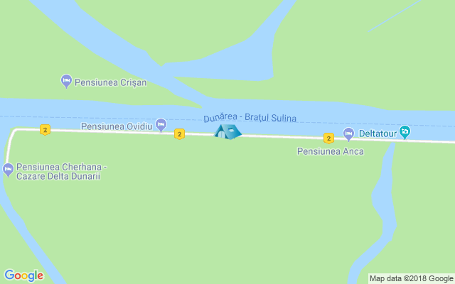 Campingul(cu cort sau in rulota proprie) este situata pe malul drept la confluenta dintre Bratul Sulina si Dunarea Veche avand avantajul ca distantele catre lacuri, canale si locuri de pescuit sunt cat mai scurte. Este o locatie aerisita, cu mult spatiu verde cu posibilitatea de amplasare de corturi.
